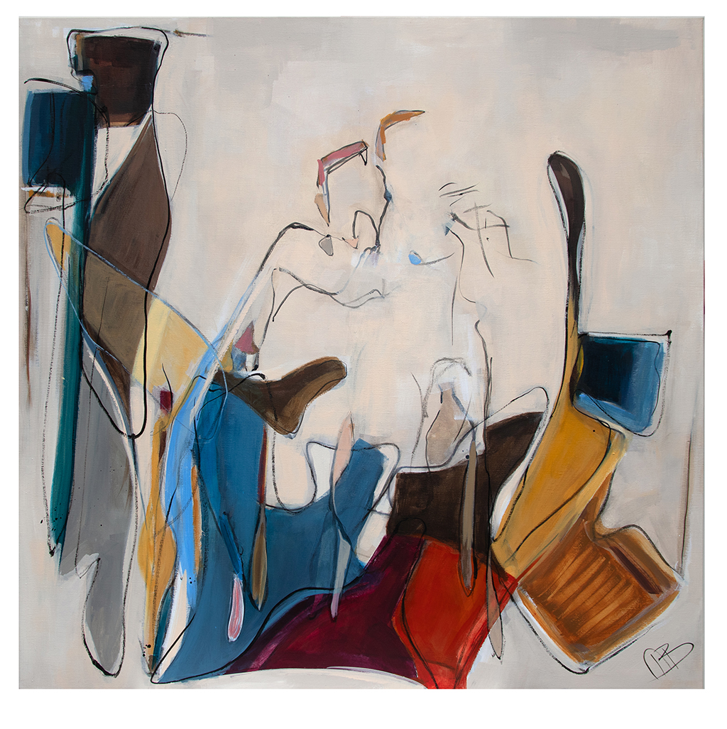 “Happy couple” The assignment was to create a personal painting with a deeper meaning for Jessy and Luuk. That is what it has become, the building blocks on which a relationship is built, in motion like life itself, in symbolic colours with a touch of intensity and humor.